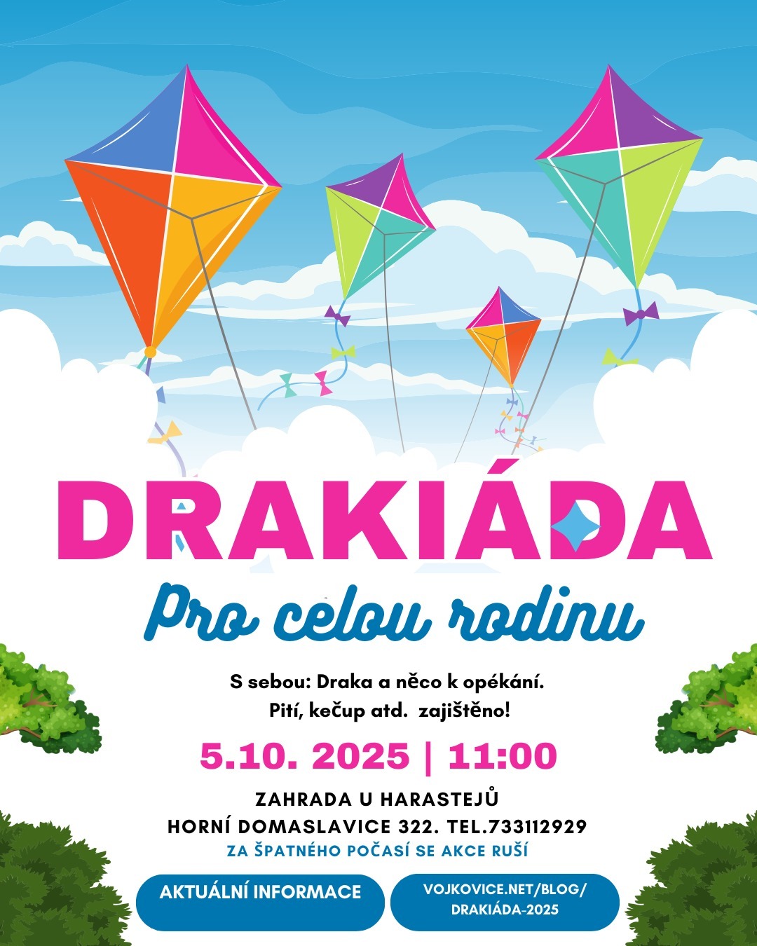 Zveme vás k příjemně prožité neděli. Děti se můžou těšit na soutěž v pouštění draků a jiné zábavné hry, na skákací hrad a jízdu na konících. A všichni se opět jako každý rok těšíme na výborné domácí trdelniky :-)
