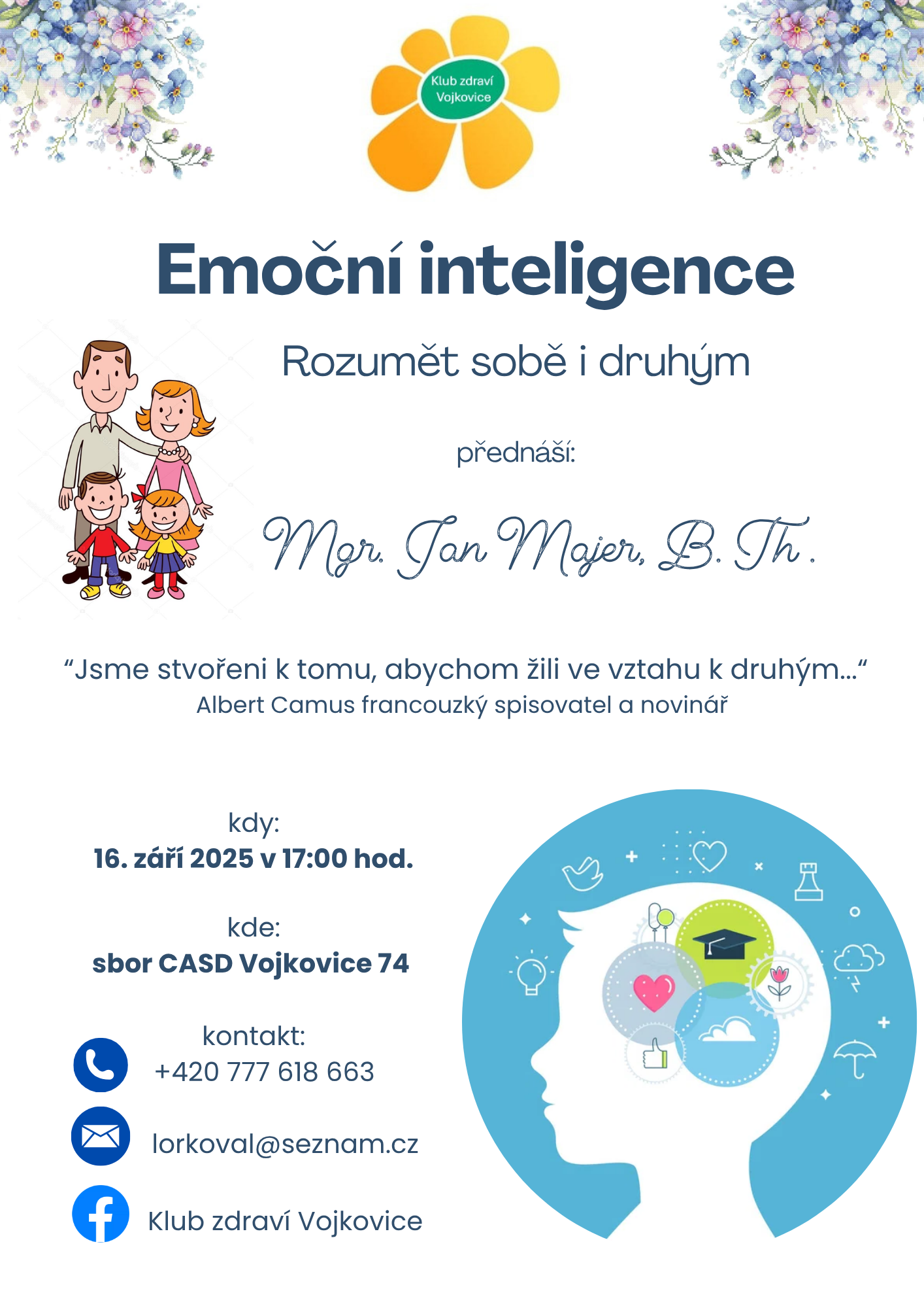 Zveme vás na klub zdraví, tentokrát na téma: "Emoční inteligence" s Janem Majerem. Přijďte v úterý 16.9. od 17 hodin do našeho sboru Vojkovice 74. Těšíme se na vás.